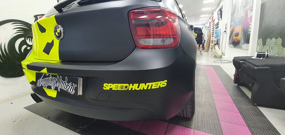 Cambio de color de un JBMW SERIE 1 con diseño personalizado en negro mate y amarillo fluor de HEXIS.