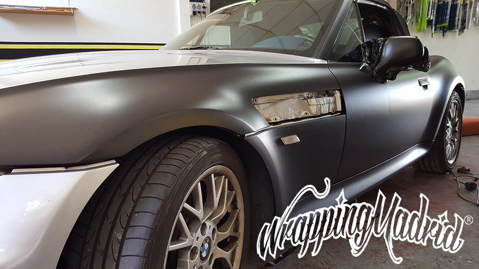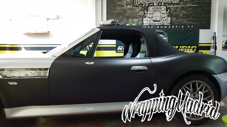 Cambio de color incluido pasos de puertas de un BMW Z3 de plata a negro mate y vinilo efecto carbono negro de HEXIS.