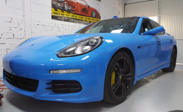 Cambio de color incluido pasos de puertas de un PORSCHE PANAMERA de negro a azul de HEXIS con reposición de logos y pintura de llantas en negro brillo.